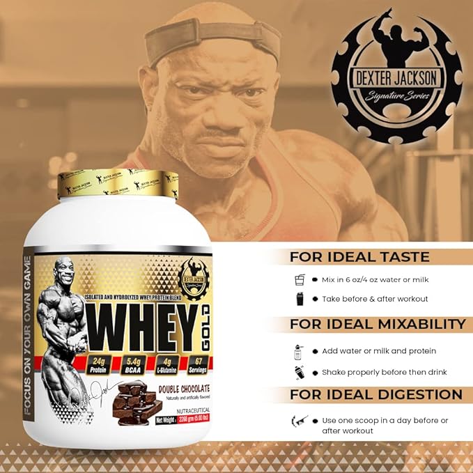 When standard whey isn't enough, turn to the Dexter Jackson Whey Gold. This is not just a protein; it's a precisely engineered blend combining the two fastest and purest forms of protein—Whey Isolate and Hydrolyzed Whey Protein. Formulated for maximum muscle absorption, faster recovery, and the elite results demanded by champions.